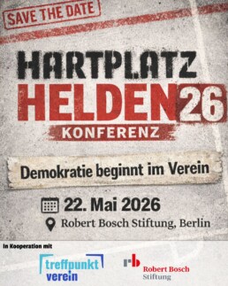 Am 22. Mai 2026 ist es so weit. Dann steigt die zweite Hartplatzhelden Konferenz. Diesmal in den Räumen der Robert Bosch Stiftung in Berlin. Diskutiert mit, vernetzt euch, habt Freude, seid dabei! Die Infos findet ihr regelmäßig aktualisiert hier –>